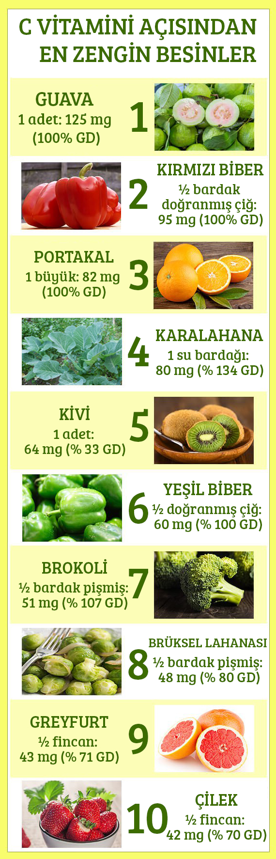 Bu C vitamini besinler listesindeki kaynaklardan 2-3 tane tüketmek C vitaminini optimal seviyede tutmaya yardımcı olur.